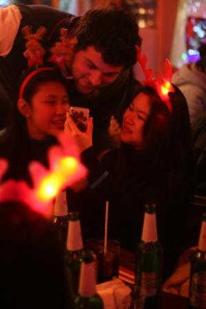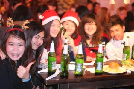 晚上八点,桌上有汉堡,有披萨,还有留学生的思乡之情。离开家乡,离开父母的他们每逢佳节也会加倍的想念家人。大家聚集在一起是迎接新的开始,迎接新的友谊和新的未来。十点,欢乐的音乐开始响起,每个人都很开心的唱歌跳舞,到处都是留学生们的笑脸,好像忘记了所有烦恼。更开心的是,人人交换礼物,抽号码,选礼物。虽然没有家人的礼物但是有朋友们的礼物,朋友们的关心,这才是最重要的。酒会在凌晨3点钟结束。