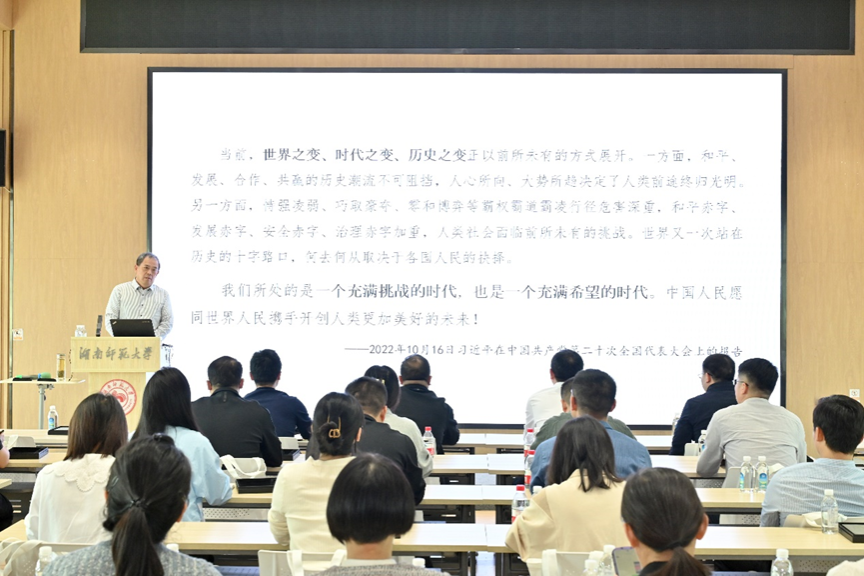 第二阶段,大家在腾龙楼共同聆听了我校“潇湘学者”特聘教授,中国国际问题研究所研究员,中国军控与裁军协会副秘书长、研究部主任、中国南亚学会理事,中国国际问题研究院美国研究所所长兼军控与国际安全研究中心主任滕建群做的《当前国际形势走向与中美关系及我之应对》的专题讲座。讲座由学校副校长唐贤清主持,他对省委编办一行表示欢迎,并对近年来省委编办对学校事业的支持表示感谢。滕教授从美国对华政策演变、地缘政治、圈子战术、军事技术等方面,数据详实、深入浅出地分析了当前国际形势下的中美关系,内容丰富,生动精彩,令大家受益匪浅。