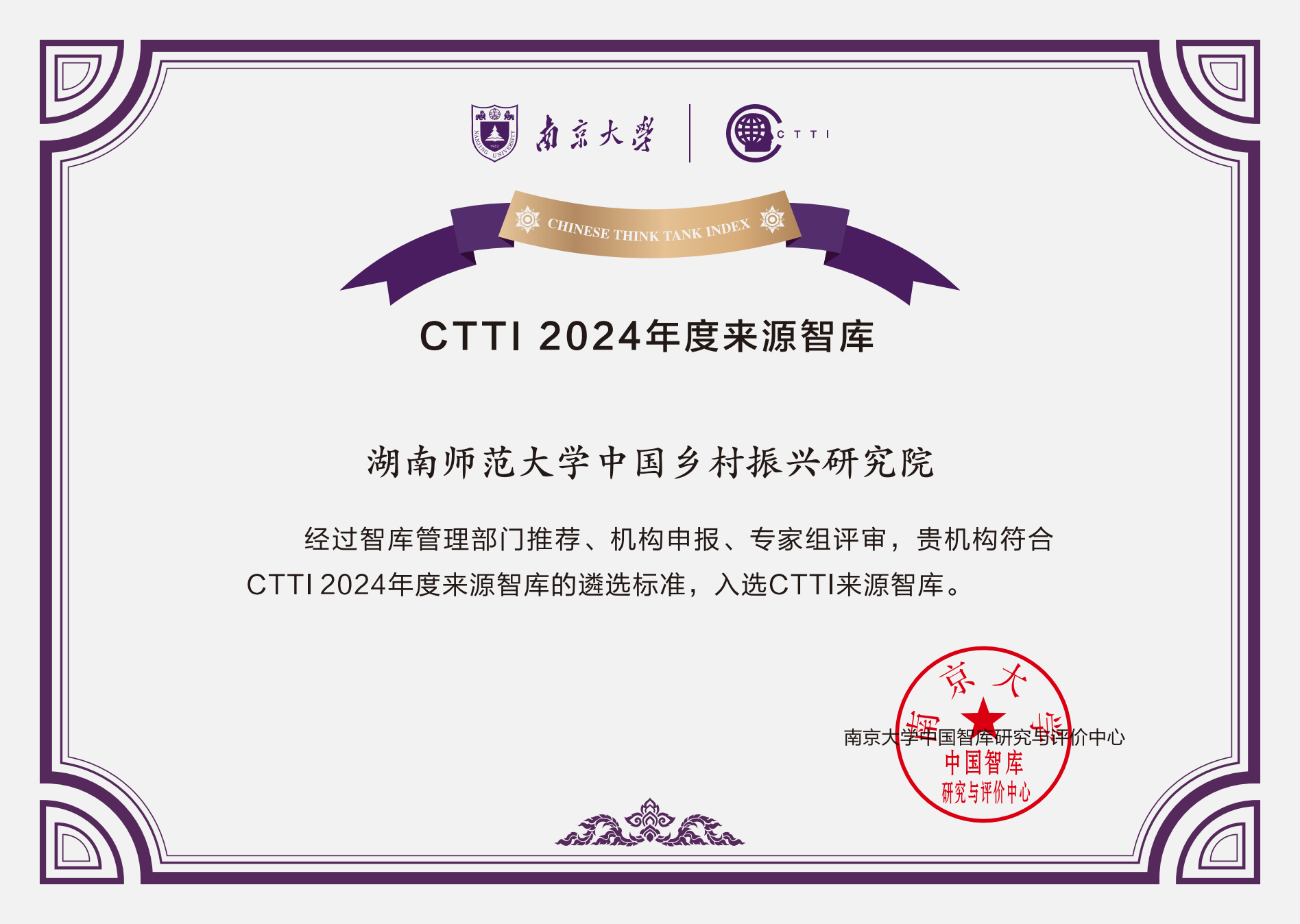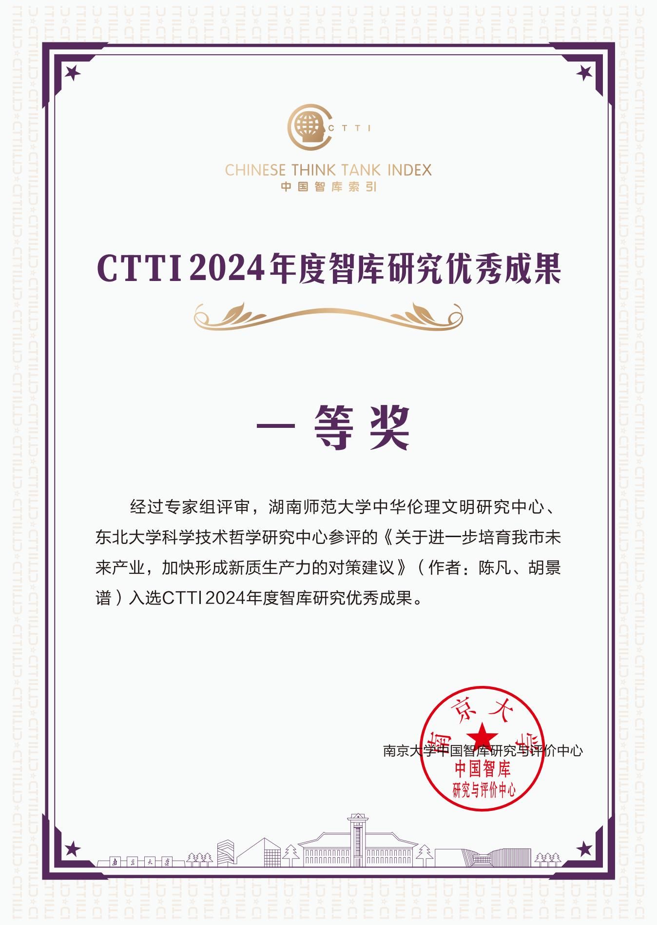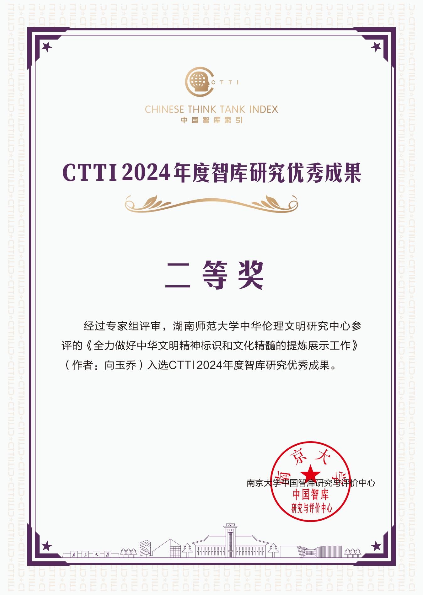 论坛发布了中国智库索引(CTTI)2024年度增补来源智库名单、2024年度智库研究优秀成果名单。金宝搏官方188中国乡村振兴研究院被遴选为中国智库索引CTTI新增来源智库,推荐的《湖南巩固拓展脱贫攻坚成果与乡村振兴有效衔接研究》荣获CTTI 2024年度智库研究优秀成果特等奖;中华伦理文明研究中心推荐的《关于进一步培育我市未来产业,加快形成新质生产力的对策建议》荣获CTTI 2024年度智库研究优秀成果一等奖,《全力做好中华文明精神标识和文化精髓的提炼展示工作》荣获CTTI 2024年度智库研究优秀成果二等奖。