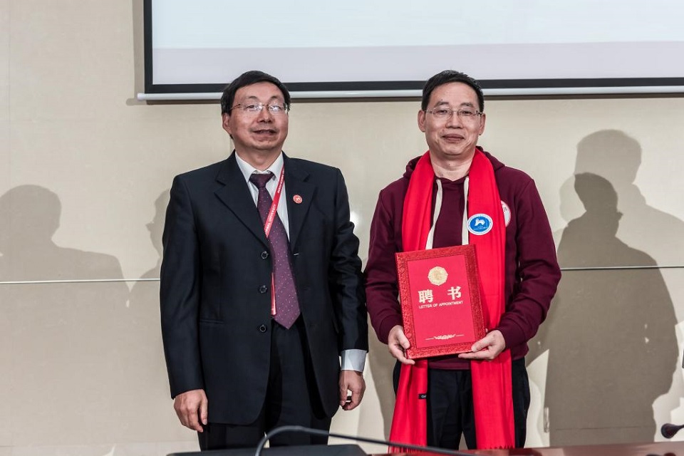匡乐满、卢岳华、瞿树林为校友刘令安、刘习明、谈发金颁发兼职教授聘书。