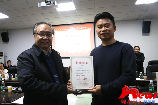 校友总会秘书长杨玲代表学校同捐赠方签署捐赠协议,欧阳峣代表学校接受捐赠并向捐赠方颁发捐赠证书。