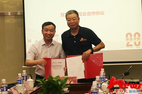 (记者 陈益)7月5日下午,我校与湖南宏博百航研学教育咨询有限公司校企合作签约仪式在国际学术交流中心四楼会议室举行,湖南宏博教育集团董事长兼总经理、我校旅游学院长沙校友会会长、2003级优秀校友刘丁杰,我校校长刘起军、副校长周俊武出席仪式。仪式由旅游学院党委书记鲁良主持。